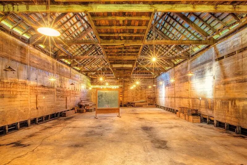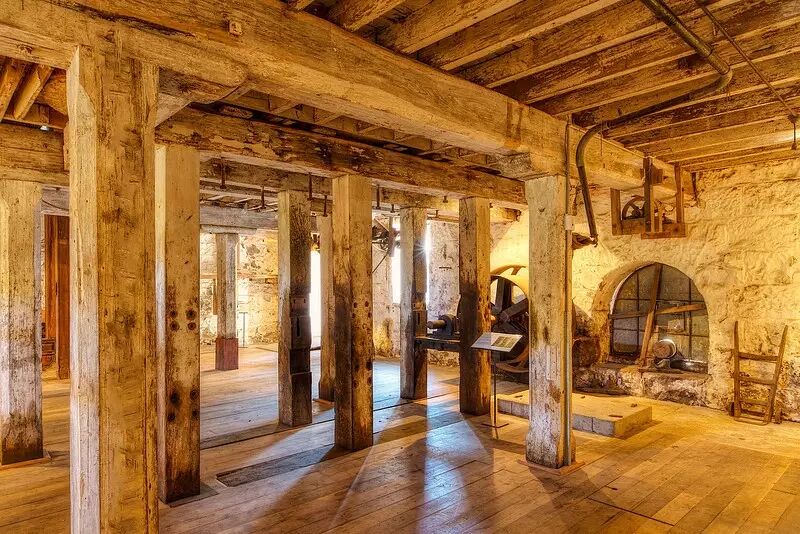 Anderson’s Mill的谷仓the Granary始建于1866年,最开始里面被隔板分成了不同的区域,不过随着1945年这里的木地板被混凝土取代之后,隔板也被拆除了。装满小麦的布袋可以通过西侧的舱口沿着中央的升降走道最终到达阁楼再码起来。铁具靠在外墙上,木制的支柱顶着外墙,或许是用以平衡里面小麦堆的重量。