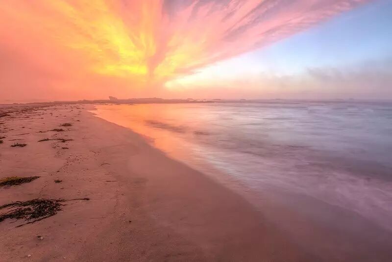这是太阳刚刚升起时海滩上还弥留着雾气的景象,此后不到2分钟,整个天空就火红一片,海滩周围都是粉红的光晕。这种情景只有你亲身到这里才能看到,或者大家就通过照片来感同身受一下吧。