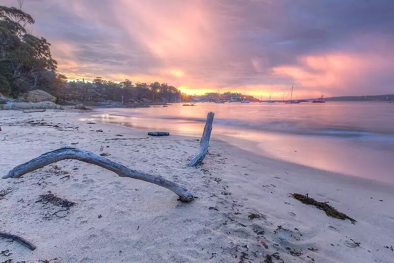 此照片是在Cornelian Bay拍摄的,虽然距离有点远,但是效果非常好,左侧的沙滩也给照片增添了一丝生气。