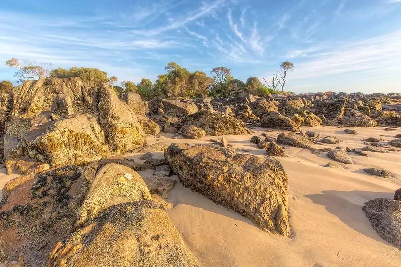 早上,太阳的光芒给Hawley Beach上的岩石镀上了一层金边,而空中的不规则云朵也让天空变得格外写意。地平线上的树则让岩石到云朵的过渡变得一气呵成,柔软的白沙更让一切都配合得非常和谐,真是奇妙的旅程。