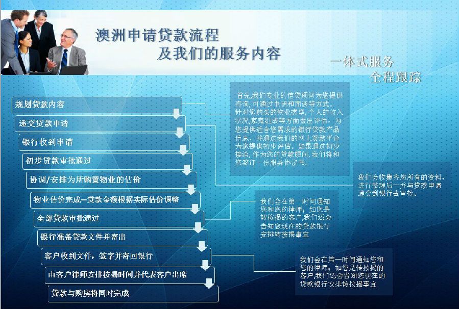 贷款所需时间一般为六周,包括评估所需时间和审订合同所需时间。所以强烈建议您如果准备买房之际首先联系贷款机构,让他们根据您的资信情况帮您做一个“预审”,告诉您可以贷出多少钱,多长时间内能贷出,这样可以帮您免除上面所述的危险。而且大多数贷款机构都有自己的合作房产中介,从他们那里您也许就同一块澳洲房产得到更优惠的价格。而在国内一般您购买房产的中介机构会帮您全程服务贷款服务。
